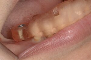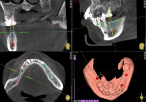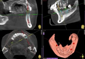今回もコンピュータガイドを使って1本1本埋入位置を確認していきます。インプラントを埋める本数やデザインは最も好ましい条件から最低限の条件まで提示し、患者さんと相談の上進めていきます。今回は3本のインプラントを埋入しました。